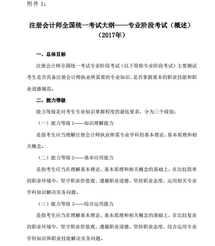 财政部注册会计师考试委员会关于印发《注册会计师全国统一考试大纲——专业阶段考试(2017年)》和《注册会计师全国统一考试大纲——综合阶段考试(2017年)》的通知。