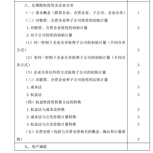 八、长期股权投资及企业合并 (一)基本概念(联营企业、合营企业、子公司、企业合并) (二)对联营、合营企业和子公司投资的初始计量 1.对联营、合营企业投资的初始计量 2.对子公司投资的初始计量 (1)同一控制下企业合并取得子公司的初始计量(不同合并 方式) (2)非同一控制下企业合并取得子公司的初始计量(不同合 并方式) (3)企业合并以外的方式取得子公司的初始计量 (三)对联营、合营企业和子公司投资的后续计量 1.成本法 2.权益法 (四)权益性投资核算方法的转换 1.权益法与成本法转换 2.成本法与公允价值计量转换 3.权益法与公允价值计量转换 (五)合营安排(包括与合营安排相关的概念、确认和计量原 则) | 1 3 3 3 3 3 3 3 3 3 3 |
