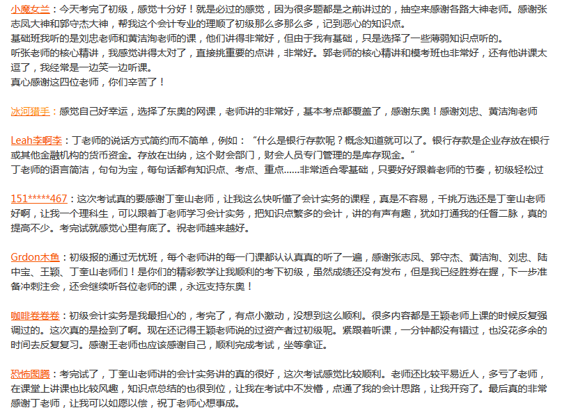 2017初级会计职称考试考后讨论区里面好热闹,不仅有考试题目回忆分享,经验总结,还看到好多考生真诚感谢东奥,感谢老师的话,看得小编有些泪目,相信胜利一定属于勤奋努力的你,祝大家2017年初级会计职称考试考的全会,做的全对!轻松过关!