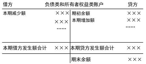 负债类和所有者权益类账户结构用T型账户表示,如下图所示。