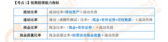 2.本章的公式看似杂乱无章,但是还是有规律可循的,可以将具有相同或相似特点的公式对比记忆,以财务比率这一部分为例,流动比率、速动比率、现金比率、现金流量比率这几个体现流动性的指标可以放在一起记忆,其公式中分母都为流动负债,只有分子不同,只需要区分分子即可。