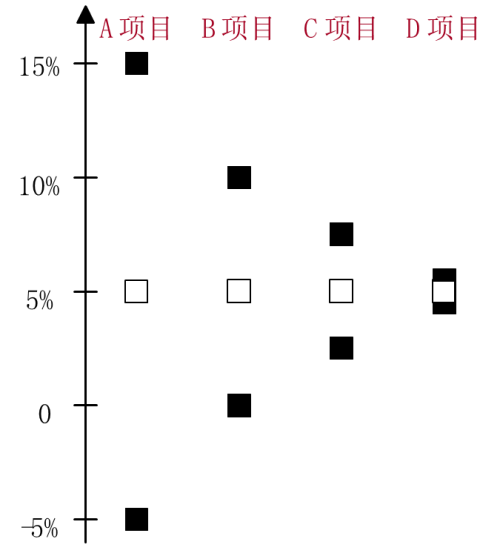 【提示】这就好比很多家庭理财时,首先追求高收益,而当收益相同时则选择看上去更稳妥的投资,那么,如何定义并计算风险呢?风险是指当环境发生变化后,项目收益率这个结果的不确定性,直观上感觉A项目的不确定性最高、B项目次之,模拟新增的C项目的不确定性较低、而D项目的不确定性几乎消除了。