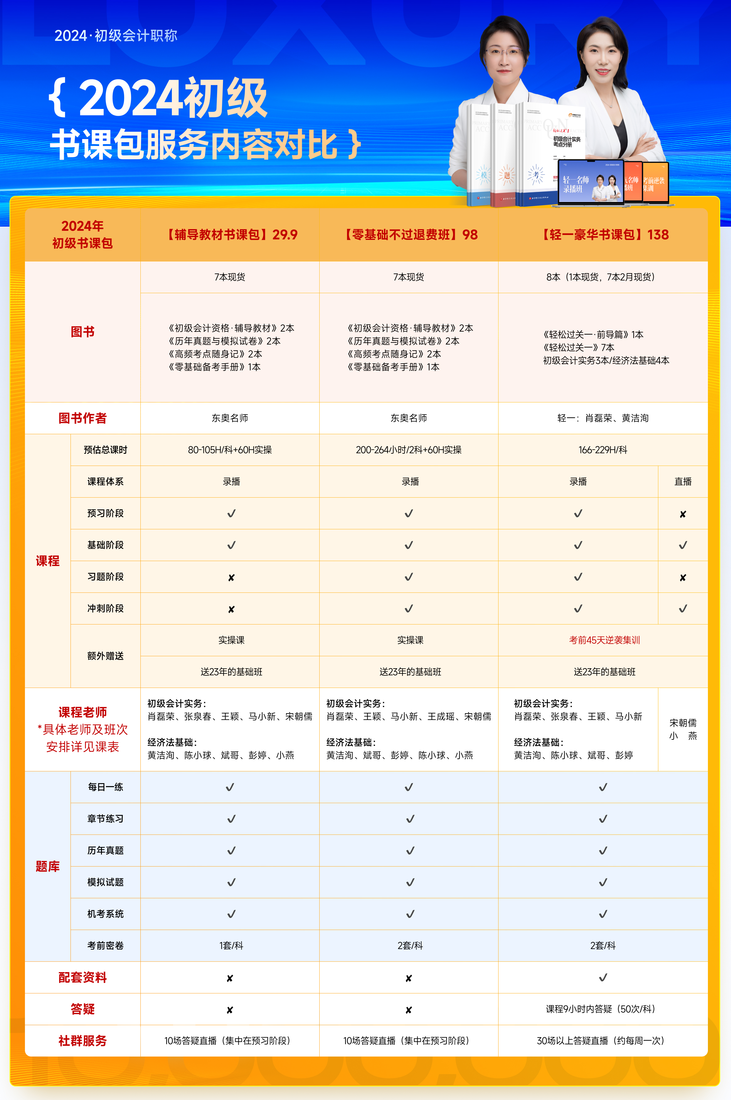 2024年初级【辅导教材书课包】、【零基础不过退费班】与【轻一豪华书课包】区别如下表: