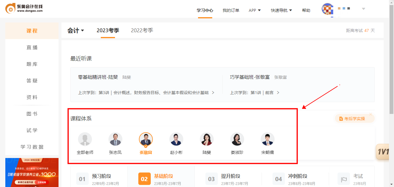 【pc端】:1、登录学习中心后需要切换到正确科目,点击全部老师或者点击老师头像即可看到对应老师的课程,如下图。