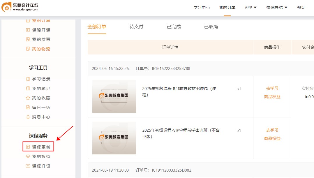 登录学习中心后,点击“我的订单”,左下角找到“课程更新”选项;