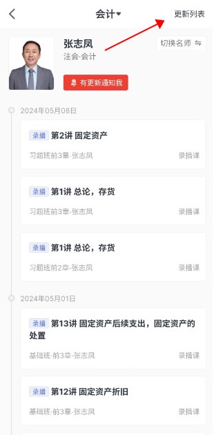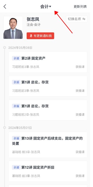 点击后,优先显示我们学习中的课程更新情况,可以切换全部课程,也可以左上角选择考种/科目;