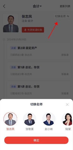 进入后,可以在上方切换科目(如图1),右侧切换不同老师(如图2),也可以查看全部更新进度(如图3)