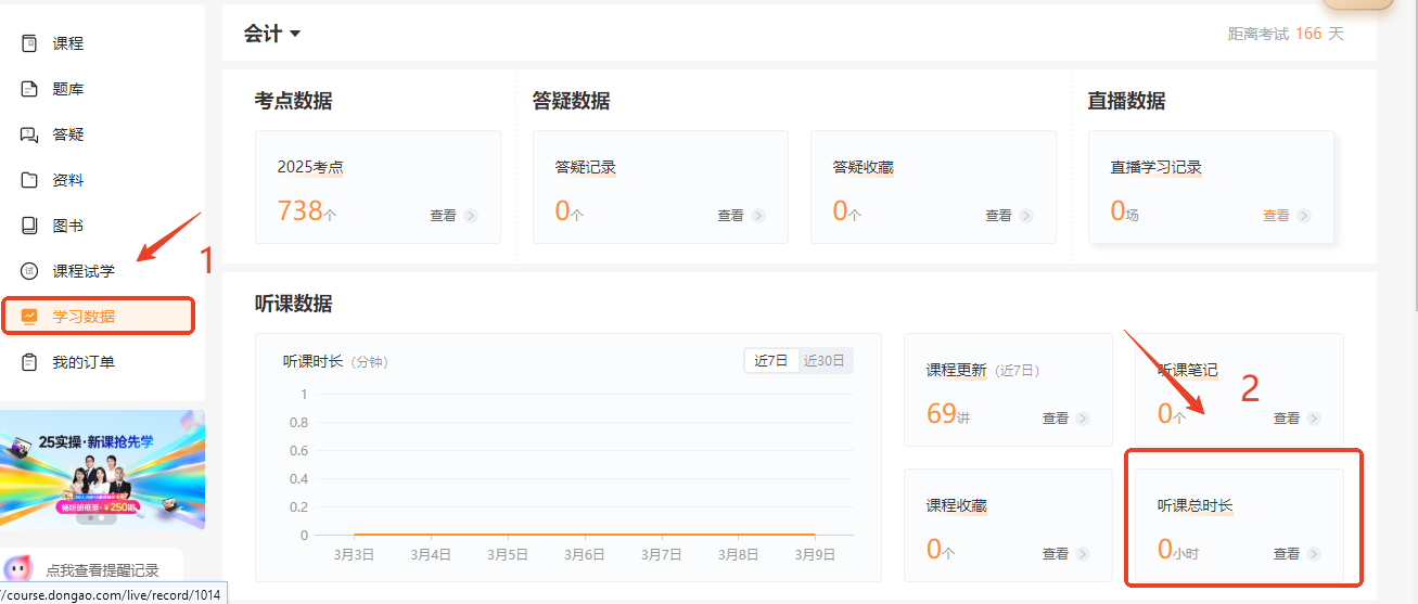 【电脑端查看听课时长】学习中心→左侧学习数据即可查看听课时长统计。