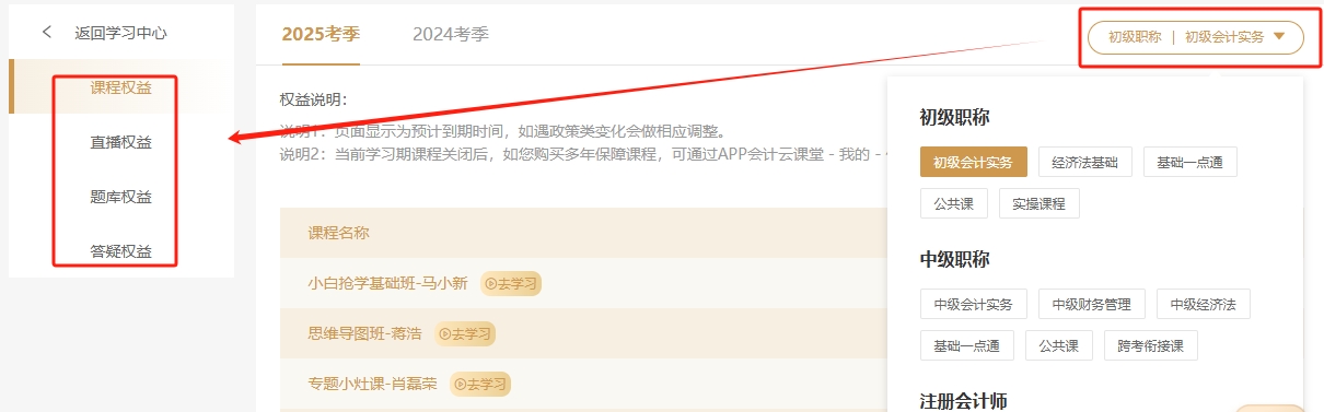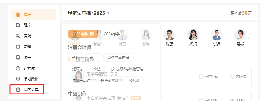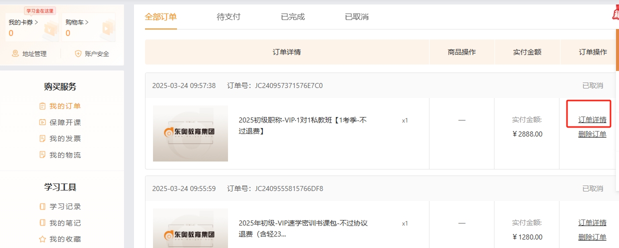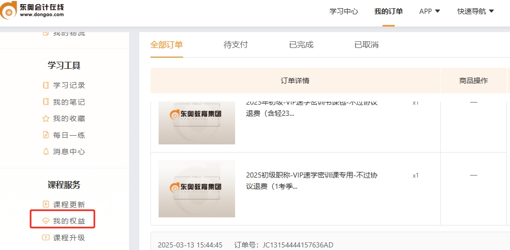 2、查看购买课程套餐包含的内容及服务,可在【我的订单】-【我的权益】中查看: