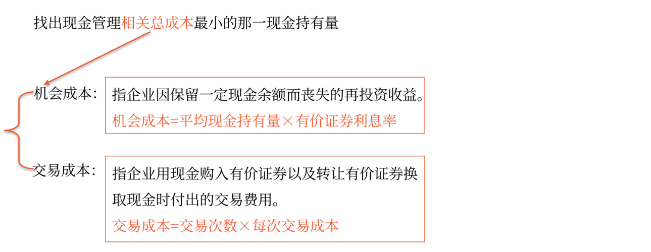 与现金持有量的关系 | 正比例变动 | 无明显的比例关系(固定成本) | 反向变动 |