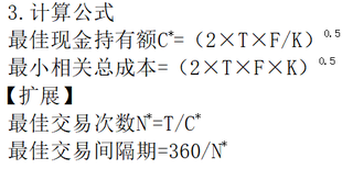 (2)该模型假定现金的流出量稳定不变,假设计划期内未发生其他净现金流入,需要现金靠变现证券满足未考虑现金安全库存。实际上这很少出现。