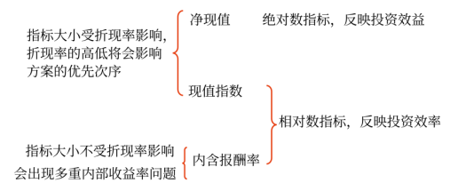 指标间的关系 | NPV>0,PVI>1,IRR>基准折现率 | DPP< 寿命期 | PP<寿命期 | 不一定 |
