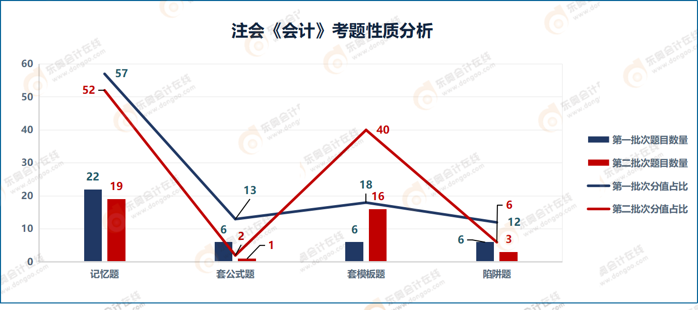 在第一批次考试中,记忆题所占的分值最多,为57分;套公式题、套模板题、陷阱题题量一致,分值比较接近;在第二套试卷中,以记忆题和套模板题为主,记忆题分值为52分,套模板题为40分;此外还有少量的套公式题及陷阱题。