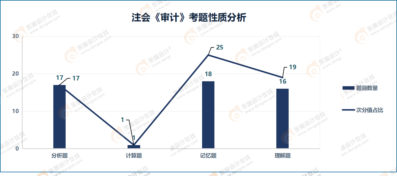注会审计试卷中,分析题及记忆题、理解题考查的较多,分值也相对较大。在考生回忆的试题中,记忆题数量最多,为18道,分值为25分。