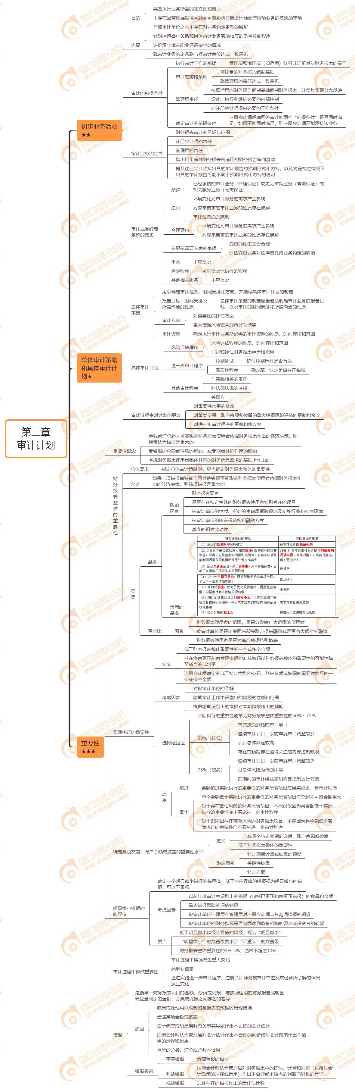 本章第三节系统的讲解了审计重要性的概念、类型及各类重要性的确定,作为计划审计工作的重点内容和本章的核心考点,考生们不仅需要系统记忆,而且还要与第十六章、第十八章、第十九章等章节联系起来理解。