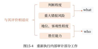 如图15-4所示,注册会计师实施审计程序的性质和范围应当与其对下列事项的评价相适应,并应当包括重新执行内部审计的部分工作。