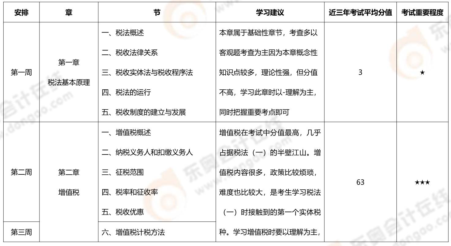 由于每位考生的基础情况不同、能用来备考税务师考试的时间不同,所以每位考生的备考计划也就不同。其实说到底一份好的备考计划就是怎样合理的分配自己能用来备考的时间,各位考生应该根据自身的实际情况,制定一份适合自己的备考计划。还没有制定备考计划的考生可参考东奥会计在线根据章节内容及重要程度整理的基础阶段各科备考计划!下面是《税法一》科目基础学习计划,考生可点击下方链接了解更多科目备考计划!