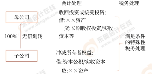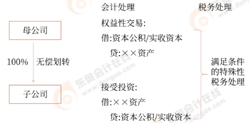 2.100%直接控制的母子公司之间,母公司向子公司按账面净值划转其持有的股权或资产,母公司没有获得任何股权或非股权支付。母公司按冲减实收资本(包括资本公积,下同)处理,子公司按接受投资处理。(顺流无偿)