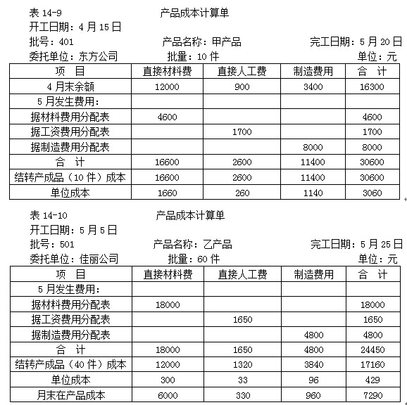 【例14-10】某企业按照购货单位的要求,小批生产某些产品,采用分批法计算产品成本。该厂4月份投产甲产品10件,批号为401,5月份全部完工;5月份投产乙产品60件,批号为501,当月完工40件,并已交货,还有20件尚未完工。401批和501批产品成本计算单如表14-9和表14-10。各种费用的归集和分配过程省略。