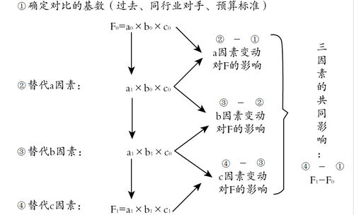(2)差额分析法 a因素变动对F的影响:(a1-a0)×b0×c0 b因素变动对F的影响:a1×(b1-b0)×c0 c因素变动对F的影响:a1×b1×(c1-c0) 注意连环替代的顺序,一般题中都会有说明 |