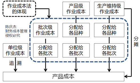 生产维持级作业成本 | 无法追溯到单位产品,并且和产品批次、产品品种无明显关系的成本,应首先分配到不同产品品种,然后再分配到成本对象(如某订单),最后分配给单位产品,也可以直接依据直接人工或机器工时分配给成本对象 |