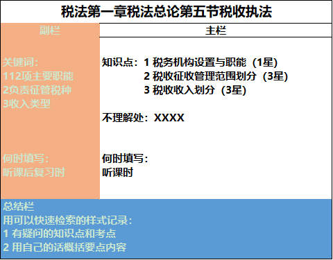 以《税法》第一章税法总论第五节税收执法为例。上网课时,在主栏中根据老师总结的知识的重要程度,分星级记录知识点,如有不理解的地方也可记录在主栏中;在课后根据主栏中的记录、问题有针对性地进行巩固复习,并提炼出适合自己的关键词记录在副栏中。在之后的复习中,可掩盖主栏,根据副栏中的关键词复述出知识点和问题答案,并在总结栏中用自己的话总结归纳要点,以检查知识的掌握程度,筛选出薄弱点。