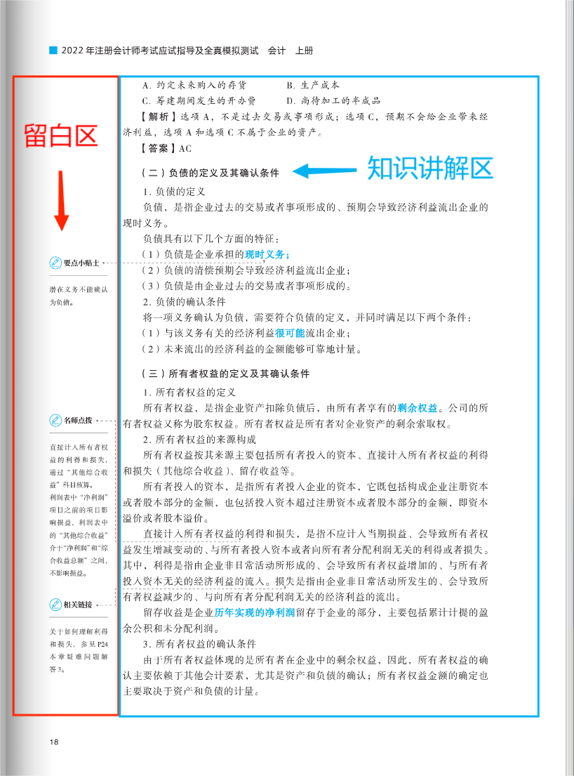 但康奈尔笔记法虽好,却需要考生从头开始记录,整理,归纳,如果总结得不到位,反而事与愿违。对于偏好记笔记学习的考生来说,东奥出品的《轻松过关®1》为了满足学员记笔记的需求,对页面内容进行了“二八分栏”的革新。“八”是知识讲解区,包括知识点、习题等。“二”是留白区,会集中标注重难知识点、名师点拨,减轻了学员记笔记的时间支出。其他空白区域,还可供学员自行标注笔记,清晰明了。另外,学员还可扫码观看名师讲解的视频,这一切都让这本教辅图书成为了一本备考利器。