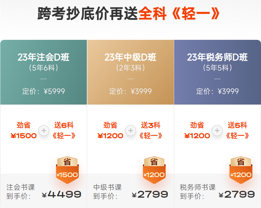 在2021年5月10日-2022年9月30日期间,购买了初级22、23考季《轻一》及组合的东奥初级学员,只需再花1元钱,即可成为【东奥会员】。在购买中、注、税三大考种的课程时,可享受超低优惠,并获赠对应考种的全科《轻一》实体书!