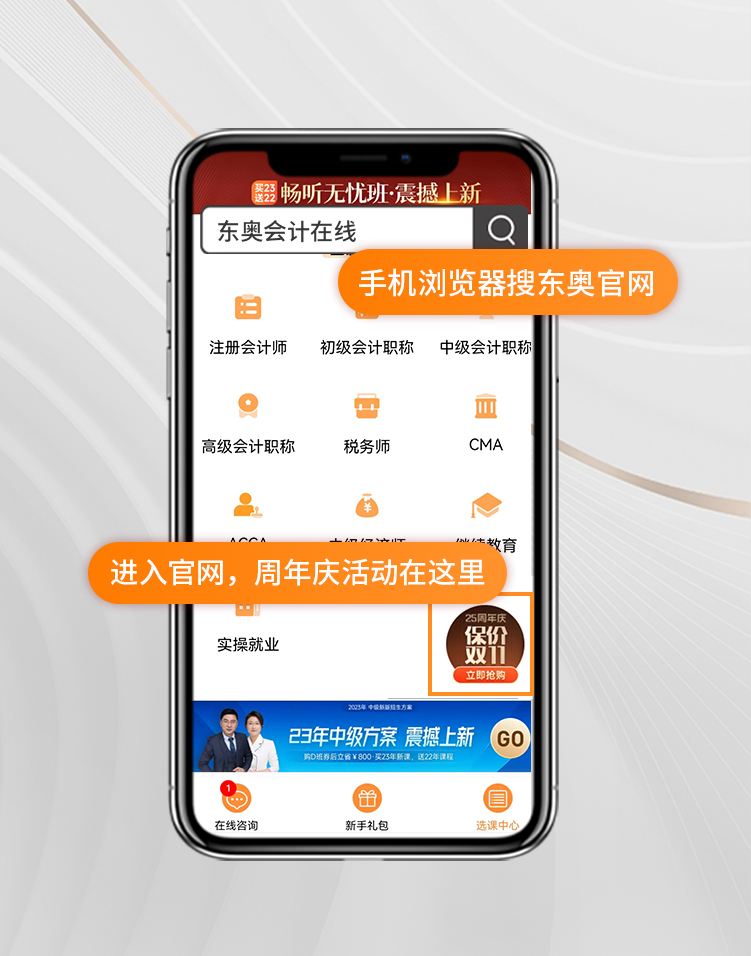 想要了解更多周年庆活动内容,手机端考生请在浏览器中搜索东奥官网,进入官网后点击下方悬浮图标即可。