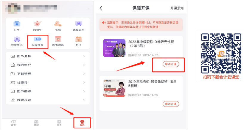 ■ 申请流程:打开会计云课堂→我的→保障开课→申请开课→人脸识别验证后→开课成功
