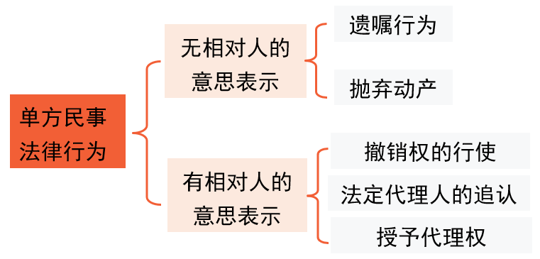 解释:遗嘱行为、抛弃动产等单方民事法律行为,属于无相对人的意思表示。值得注意的是,并非所有的单方民事法律行为都属于无相对人的意思表示,如撤销权的行使、授予代理权、法定代理人的追认等单方民事法律行为,属于有相对人的意思表示。