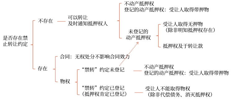 ①如果未登记,受让人不应当知道禁止转让约定的存在,因此,知道或应当知道抵押权存在的受让人取得带押物、不知道亦不应当知道抵押权存在的受让人取得无押物。