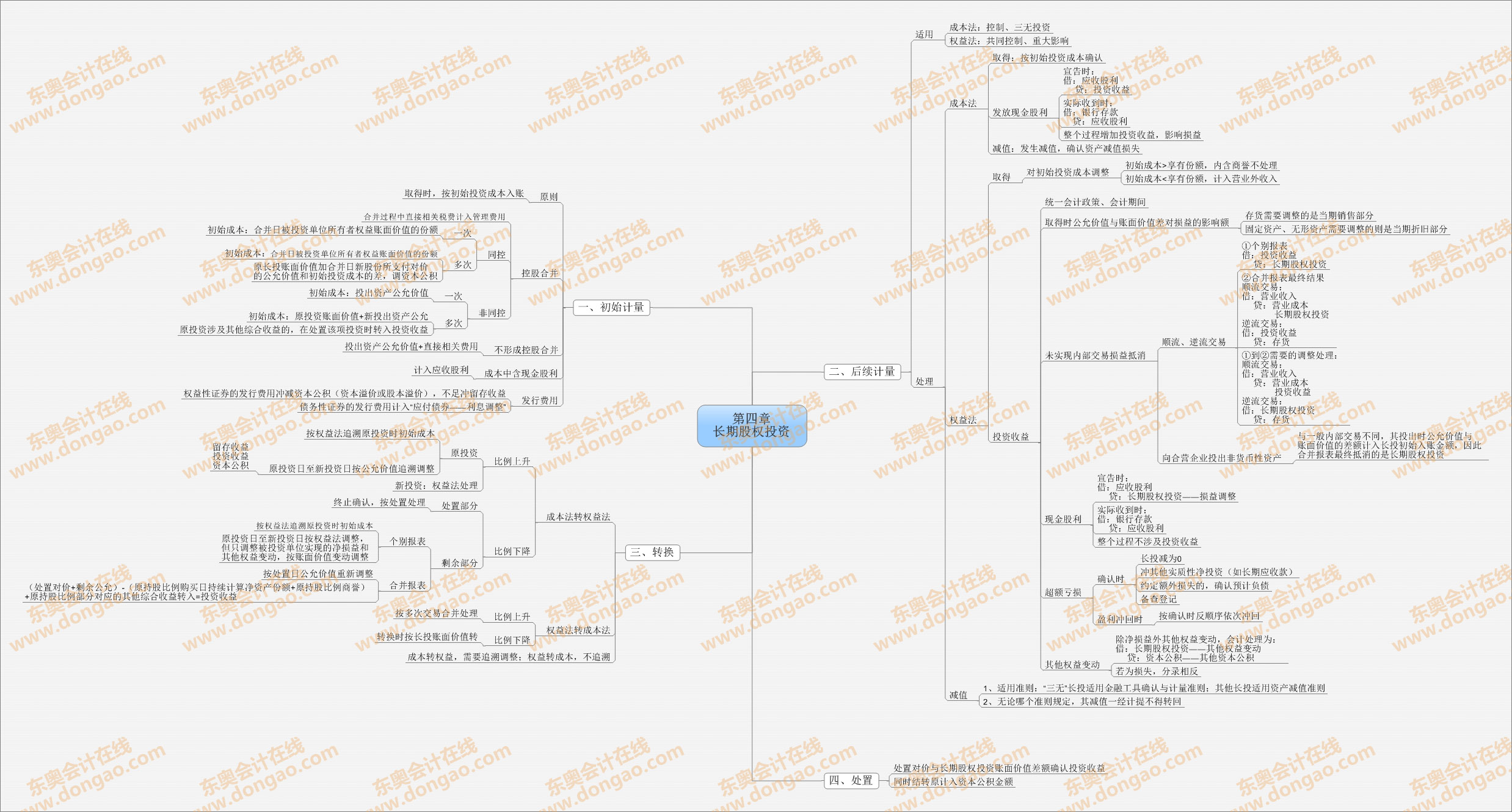 【东奥小编】2014年注册会计师考试正式进入基础备考阶段,注会知识点繁杂细碎,想要全面掌握注会各科目的知识,需要科学高效的学习方法,思维导图正是一种非常适合注会复习的学习方法,正确利用思维导图,不仅能使自己积极进行知识点总结,形成清晰的思路,还能对知识点进行快速查漏补缺。以下是2014注会《会计》第四章长期股权投资思维导图:
