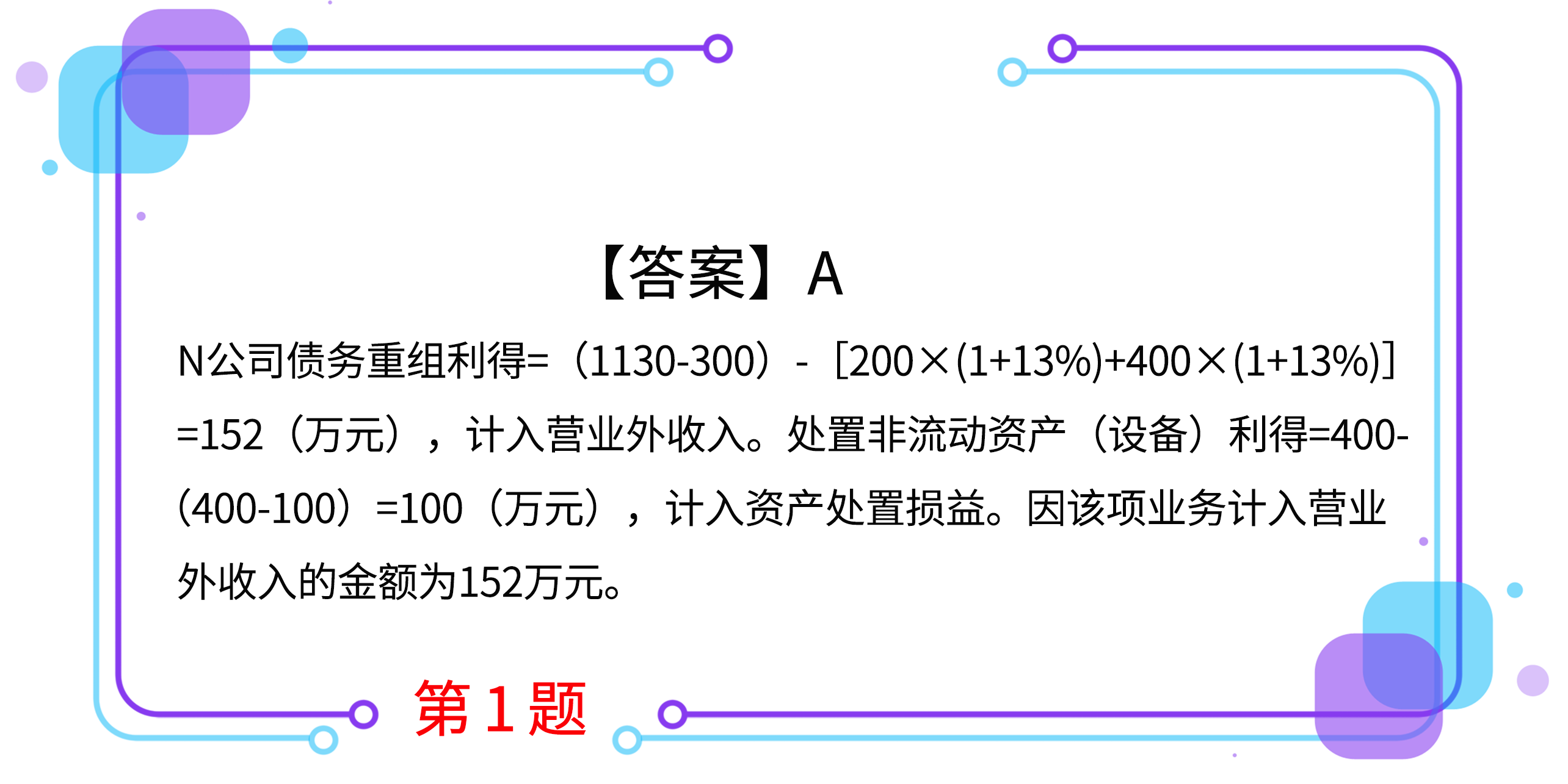 1.M公司与N公司均为增值税一般纳税人,购买及销售商品、设备适用的增值税税率均为13%。M公司销售给N公司一批商品,价款为1000万元,增值税税额为130万元,款项尚未收到,因N公司发生资金困难,已无力偿还M公司的全部货款。经协商,M公司同意N公司该笔欠款中的300万元延期收回,不考虑货币时间价值因素,剩余款项N公司分别用一批材料和一项设备(固定资产)予以抵偿。已知,原材料的成本为250万元,已计提存货跌价准备10万元,公允价值为200万元;设备原价400万元,已提折旧100万元,未计提减值准备,公允价值400万元。N公司因上述业务应计入营业外收入的金额为( )万元。