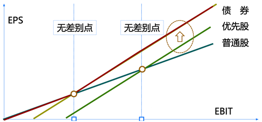 通常优先股的股利负担要高于债务税后利息——即优先股线在债券线的下边,所以考试时大多数情况下仅需要比较普通股和债券筹资即可。