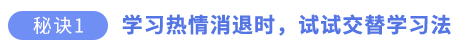 所谓交替学习法是指在复习过程中,将搭配的2~3门科目进行交替性学习。采用这种方法学习会减少我们的厌烦,保持持续的学习热情。