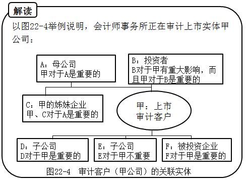 母公司是指直接或间接控制被审计单位的实体,且当被审计单位对其重要时,该母公司应当被包含在审计客户的定义中,即图22-4中的A公司。