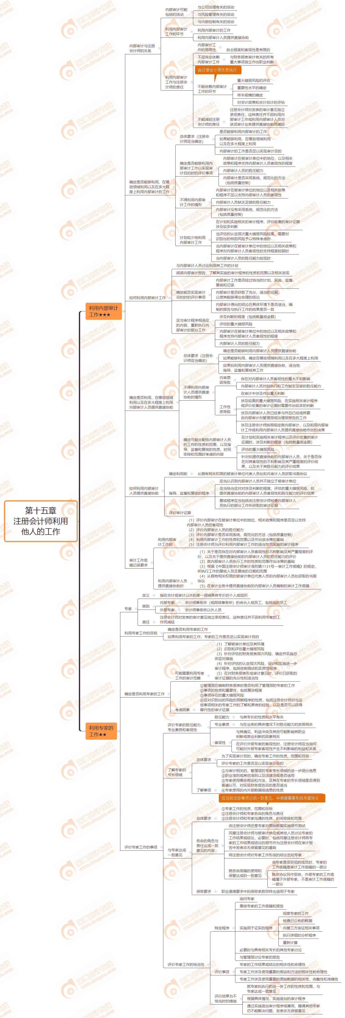本章需要掌握的内容包括:介绍注册会计师是否能够利用内部审计工作或利用内部审计人员提供直接协助,重点围绕”是否利用、在哪些领域利用以及在多大程度上利用“三个方面展开;介绍利用注册会计师专家的工作,重点是考虑如何利用专家的工作。