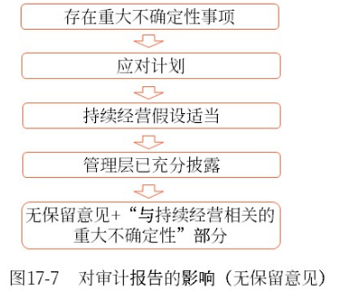 (2)说明这些事项或情况表明存在可能导致对被审计单位持续经营能力产生重大疑虑的重大不确定性,并说明该事项并不影响发表的审计意见。如图17-7所示。