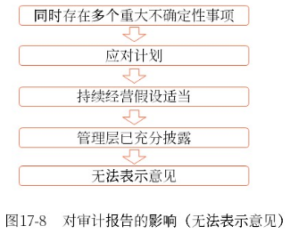 在极少数情况下,当存在多项对财务报表整体具有重要影响的重大不确定性时,注册会计师可能认为发表无法表示意见而非增加以“与持续经营相关的重大不确定性”为标题的单独部分是适当的,如图17-8所示。