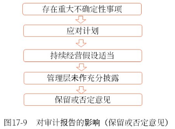 如果持续经营假设适当,但存在重大不确定性,且财务报表未作出充分披露,注册会计师应当发表保留意见或否定意见。注册会计师应当在审计报告中说明,存在可能导致对被审计单位持续经营能力产生重大疑虑的重大不确定性。如图17-9所示。
