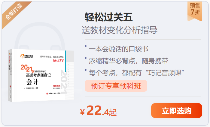 《轻松过关®5》浓缩了考试必背的考点知识点内容,将这些“精华”内容整理成册,方便考生随身携带,随时备考;对于每一个考试知识点内容,都配有“巧记音频课”,考生可以通过“会计云课堂”进行收听,利用碎片时间,帮助自己记住知识点、理解知识点内容。