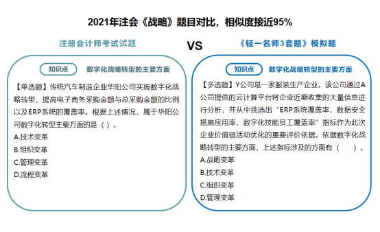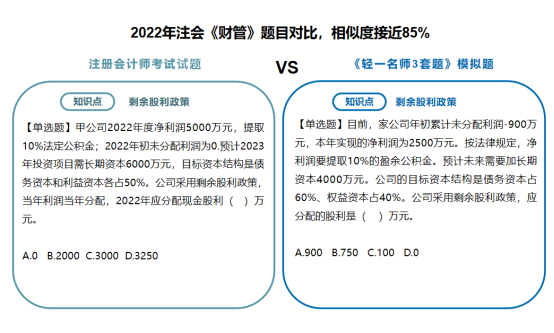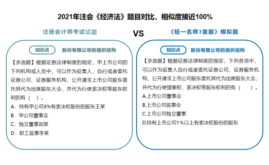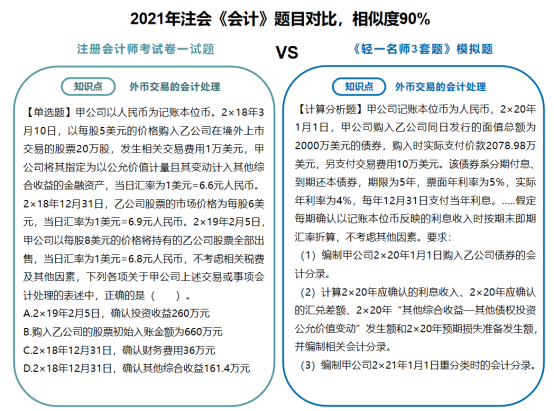 类似这样的相似题型和同一考点模拟演练的例子多年来不胜枚举。《轻一名师3套题》的编题老师们始终掌握着行业知识的前沿政策、时政变化的新趋势。自编模拟题非常符合注会“考试体制”。之所以没有在编写《轻一》时同步编排《轻一名师3套题》而是后续编拟在考前单独、免费邮寄给考生,是因为随着备考时间的推移,随着考试时间的临近,一些关键性的信息与政策才慢慢展现出来,有着20+年教培经验的东奥名师们,会与时俱进,随时调整出题思路,在考前再为考生“收集”更多的考试风向,帮助考生及时补充考点考核维度,让考生们所练的习题更具代表性,更具应试实践性。