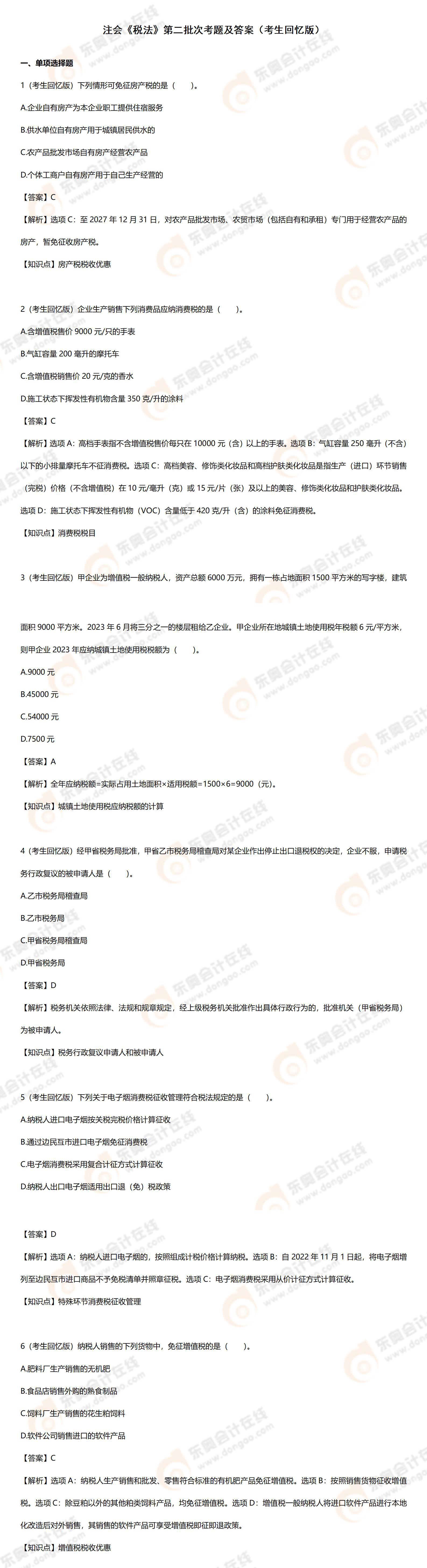 2024年注册会计师税法第二批次考题及答案解析(考生回忆版)