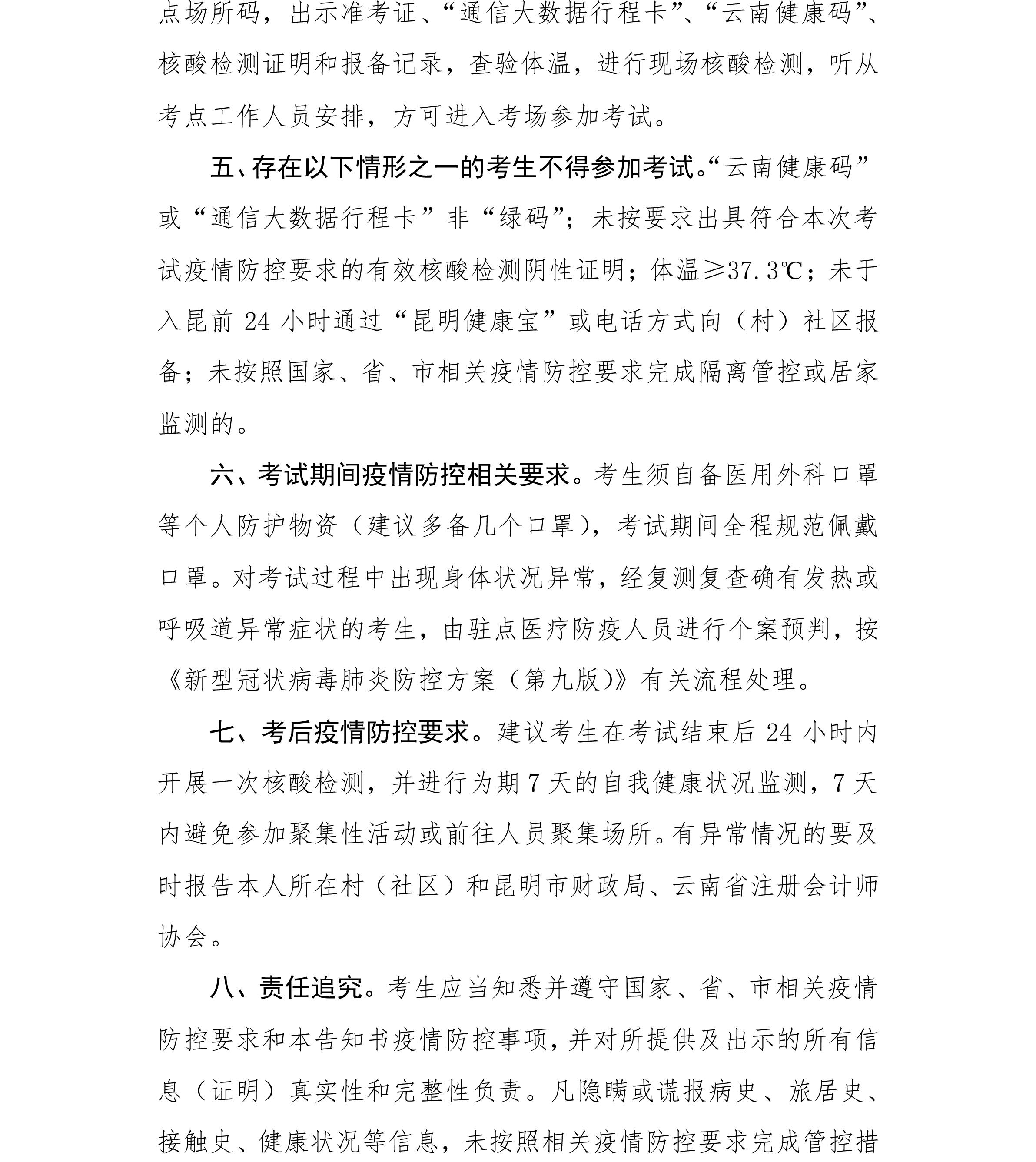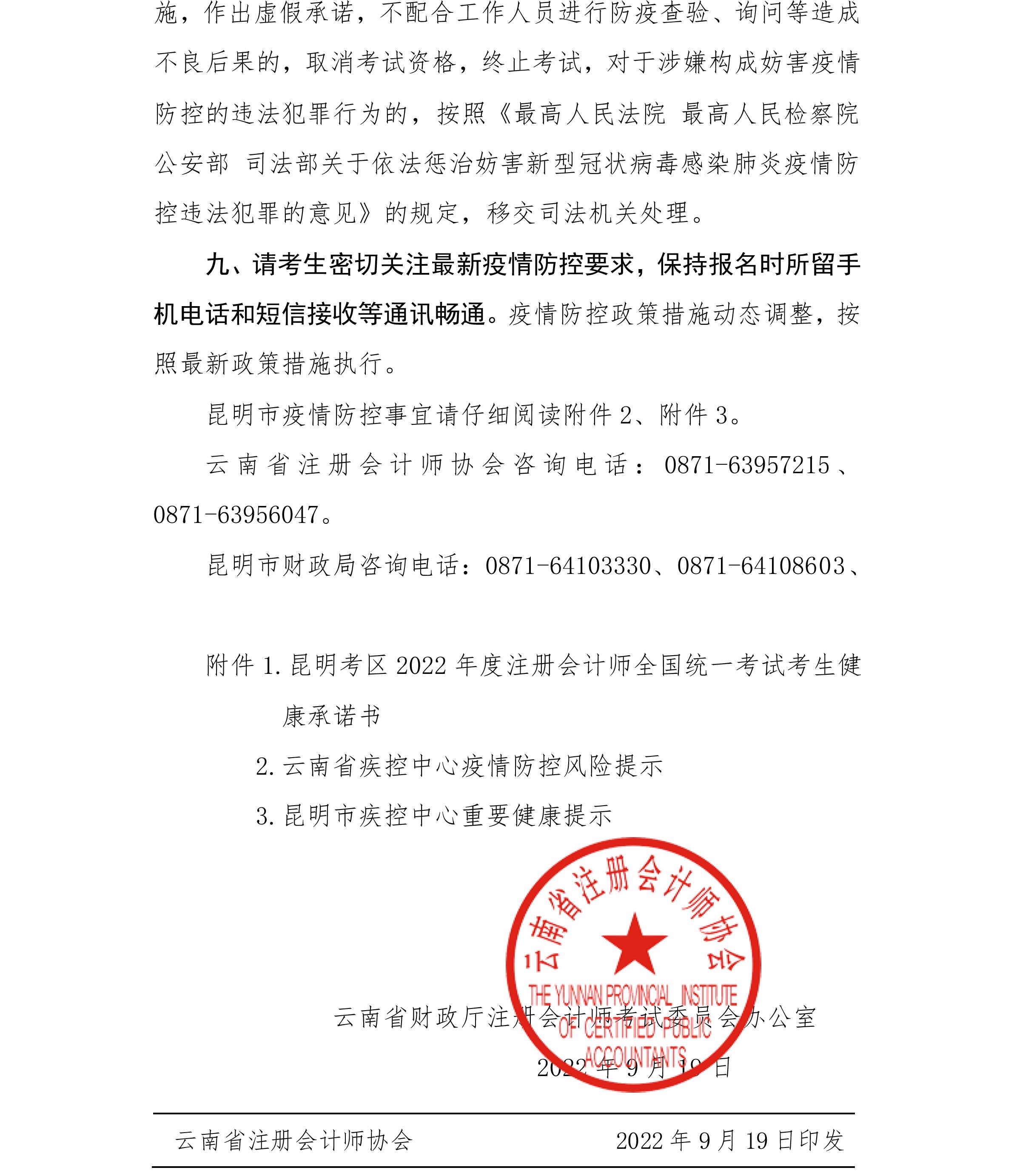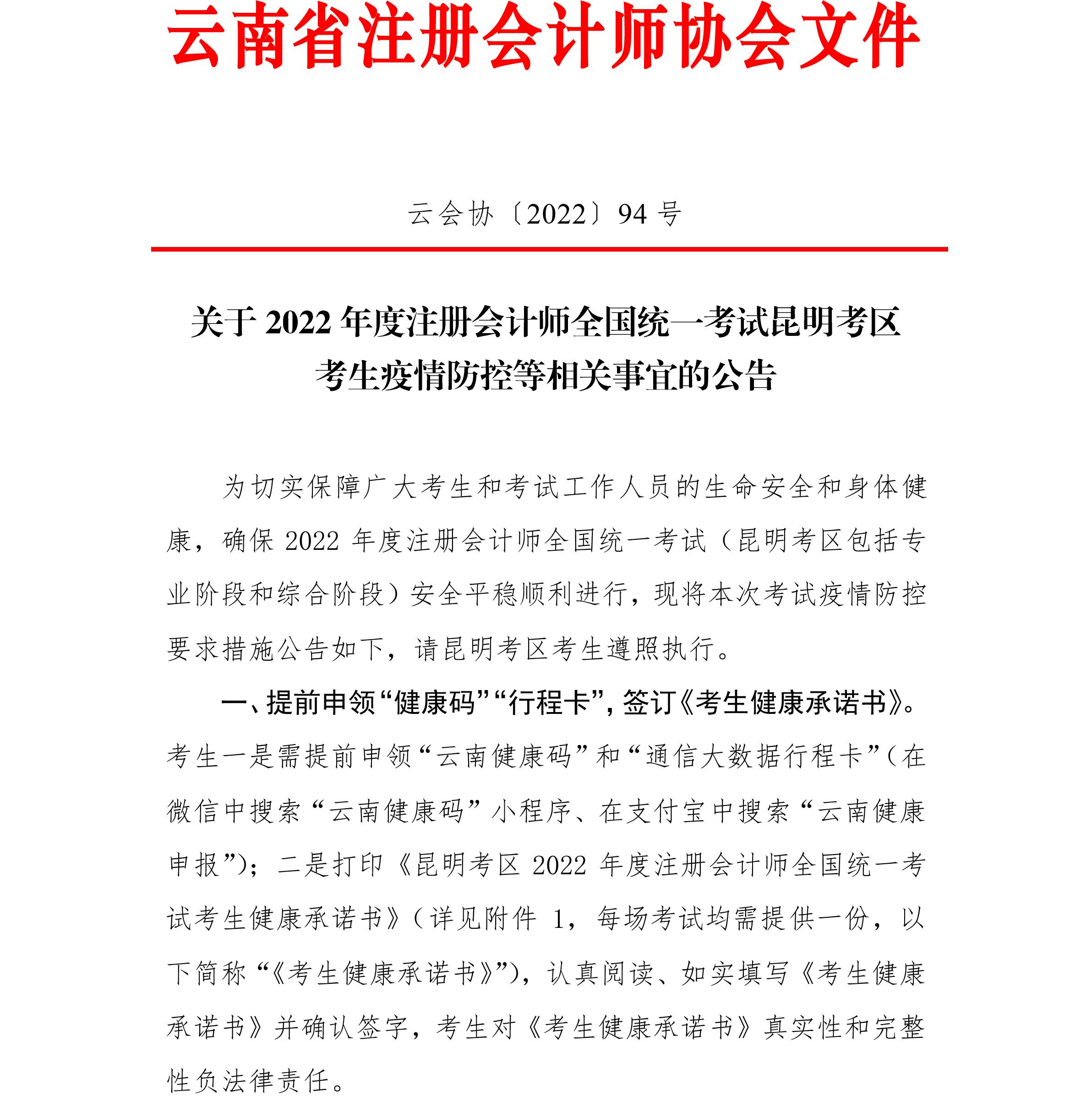 关于2022年度注会考试云南昆明考区考生疫情防控等相关事宜的公告