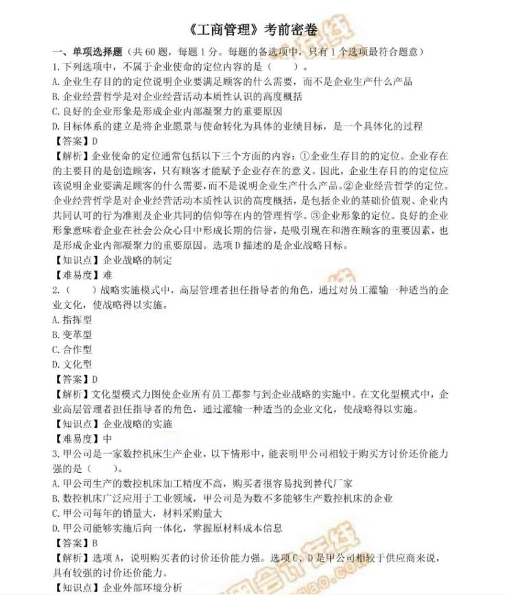 2025年中级经济师《工商管理》考前模拟试卷,涵盖企业战略、市场营销、生产管理、人力资源规划等核心章节,题型包括单选、多选及案例分析,旨在全面检验考生对专业知识的掌握与应用能力,助力考生高效备考,备考进度过半的同学们快来试试这套模拟试卷吧,建议同学们严格按照单科90分钟进行作答。
