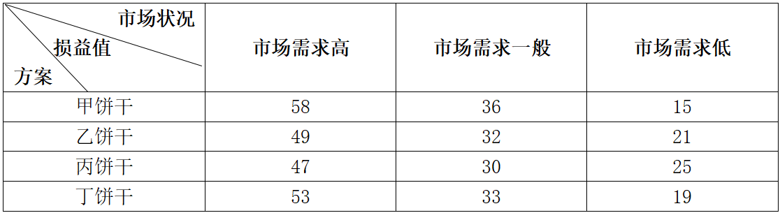1.某大型饼干生产企业采用密集型成长战略,不断挖掘和提升自身竞争优势,获得快速发展。该企业采用7S模型分析其战略过程,统筹各种资源和要素。有力保障了企业战略措施顺利实施。为了开发中老年饼干市场,该企业采用定性决策和定量决策相结合的方法进行健胃饼干的新产品经营决策。该企业共有甲饼干、乙饼干、丙饼干、丁饼干四种产品方案可供选择。每种饼干产品均存在着市场需求高、市场需求一般、市场需求低三种市场状态。对应的市场状况及损益值(单位:百万元)如下表所示: